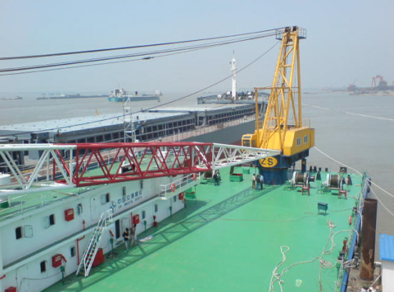 由中交二公局集团承建,采用中昇建机ZSF2700(271000)船式起重机(柴油驱动中国船级社CCS认证),最大吊重27m处吊100t,已于2008年二月于江苏省江都港口举行下水仪式且已正式啟用,此一船吊为我公司又一成功之大起重量起重设备。