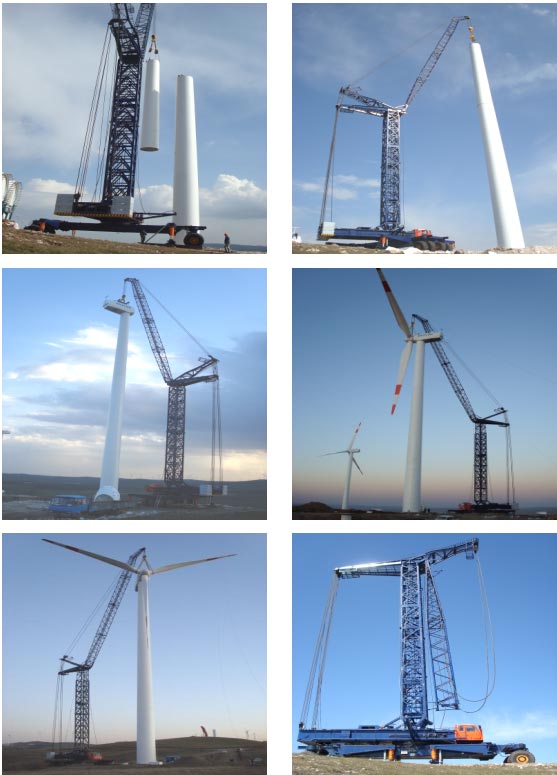 我公司自主研发的第一台轮胎行走式风电吊机于2008年9月交付使用,於内蒙古察右中旗风电项目由天津电建顺利完成现场吊装任务,此一风电吊机采用轮胎式行走,具有转场便利、抗风性强吊装稳定、起升高度高、起重量大等优点,此风电吊机采用柴油引擎驱动,最大爬坡30%,行车速度0~5km/h,最大起升高度90m,最大吊重80t(15m处) ,可满足所有1.5兆KW风电机租吊装要求。