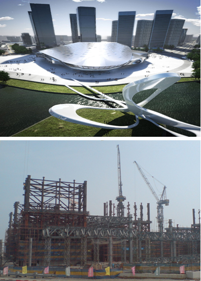 大连国际会议中心 由中建八局大连分公司承建采用中昇建机 二台ZSL750行走式动臂塔机最大吊重15m处吊50t