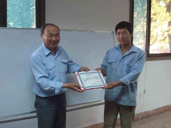 当2011年中昇颁奖仪式宣布正式开始后,首先管理部主任王德华先生谨代表我公司总经理许中豪先生向品学兼优的同志颁发结业证书。