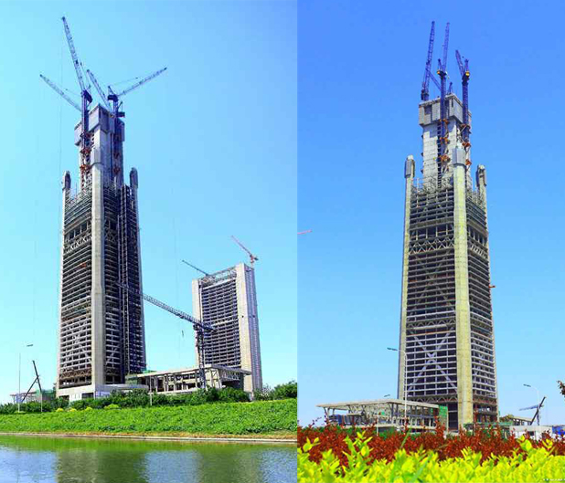 由中建三局承建的天津高银117大厦工程采用了中昇建机ZSL2700(2台)、ZSL1250(2台)共4台塔机,吊装顺利进行!ZSL2700在世界高层钢结构建设中,属超大型的内爬式动臂塔式起重机。ZSL2700采用柴油发动机引擎驱动,该塔机最大工作幅度为65m,而在27m吊装幅度范围内可吊重达100t,最大起升高度达597m,起升速度达110m/min。其吊装性能和技术水平在国内处于领先地位!