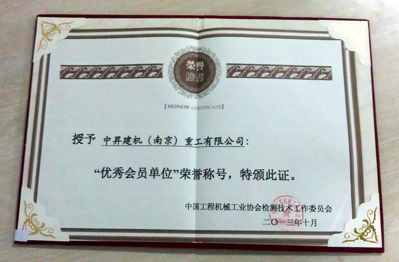 中昇建机被中国工程机械工业协会检测技术工作委员会授予2013年度“优秀会员单位”荣誉称号
