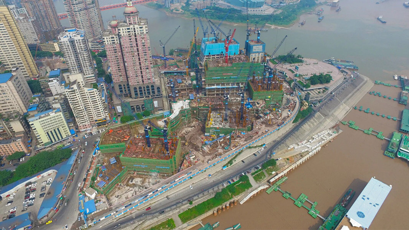 重庆来福士广场的8座塔楼,2座施工高度220m,4座施工高度248m,2座施工高度348m,采用中昇建机ZSL1700(80T)一台,ZSL1500(64T)一台,ZSL1000(64T)一台,ZSL750(50T)四台,ZSL500(32T)六台,ZSL380(32T)六台。