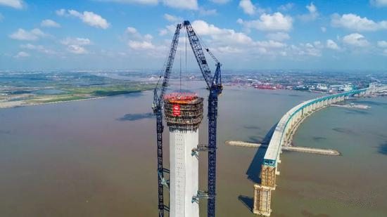 沪通长江大桥北主塔封顶 世界最高公铁桥主塔诞生
