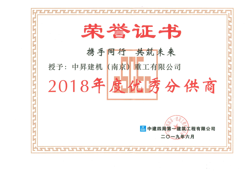2019年7月,中昇建机代表应邀出席中建四局第一建筑工程有限公司(以下简称“中建四局一公司”)“2019年项目建设总结表彰大会”,中昇建机以优异的产品和服务在众多供应商中脱颖而出,荣获“2018年度优秀分供商”荣誉称号。