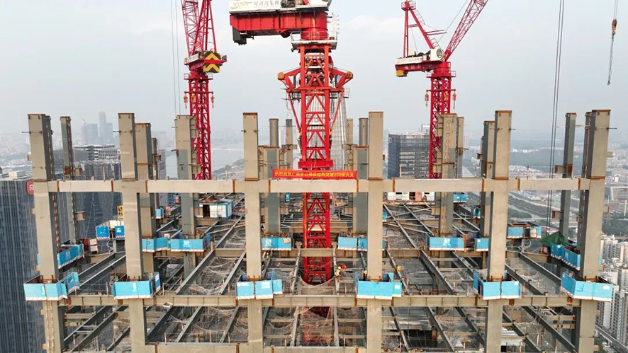 项目攻坚克难、昼夜运作,主体高度从150米到200米仅耗时126天;面对钢管巨柱工序复杂、超高泵送、塔吊附着难度高等内部重难点。由我公司生产ZSL2700一台、ZSL850两台动臂式塔机为项目的顺利进行起到了积极作用。