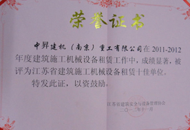 热烈祝贺中昇建机(南京)重工有限公司于2011~2012年度被评为江苏省建筑施工机械设备租赁“十佳单位”!